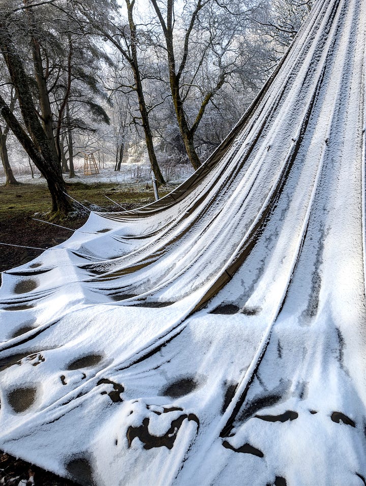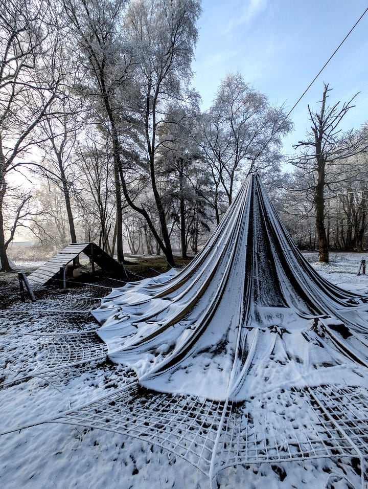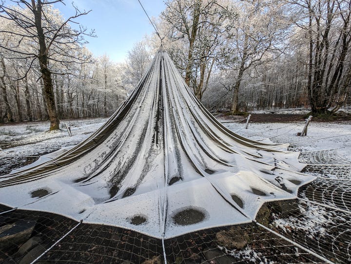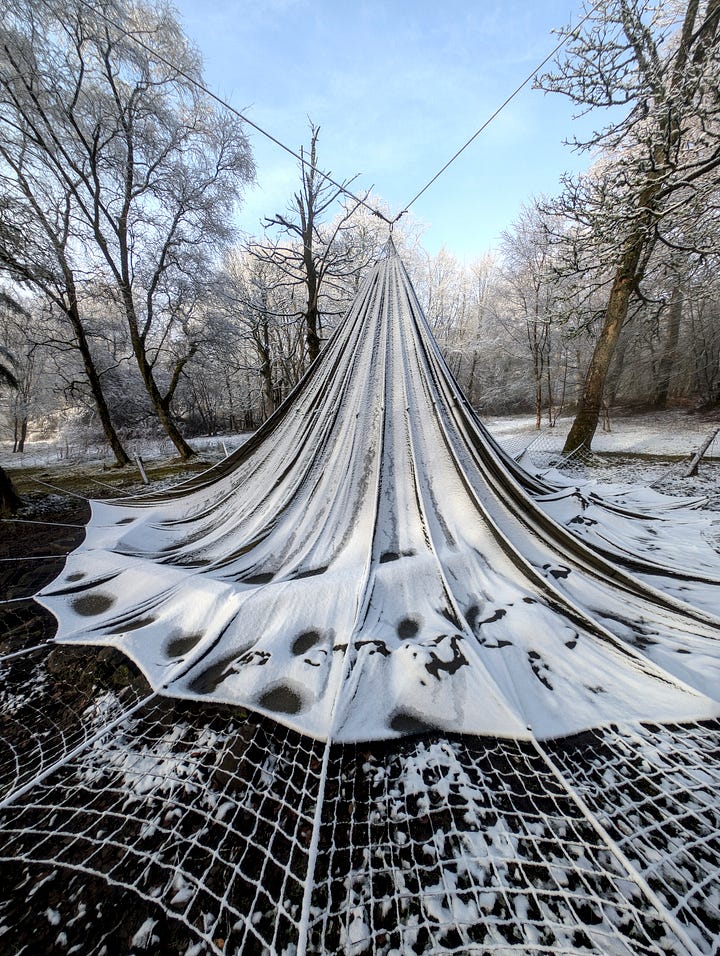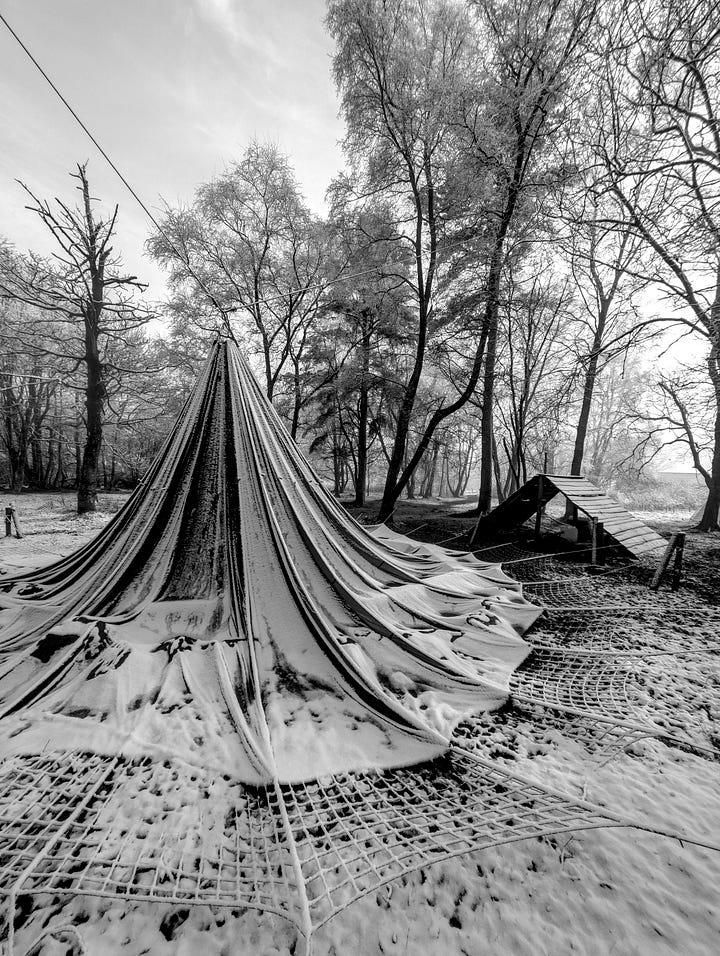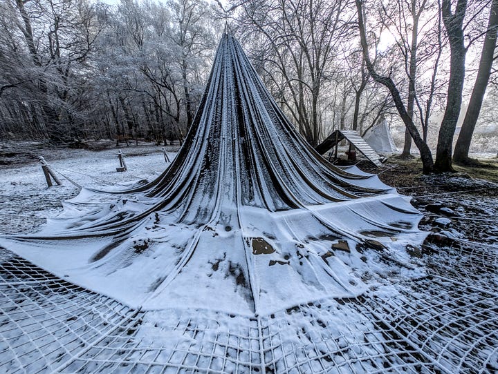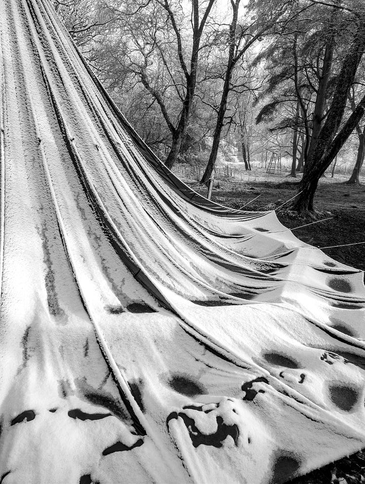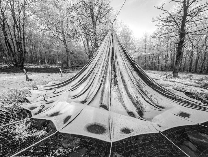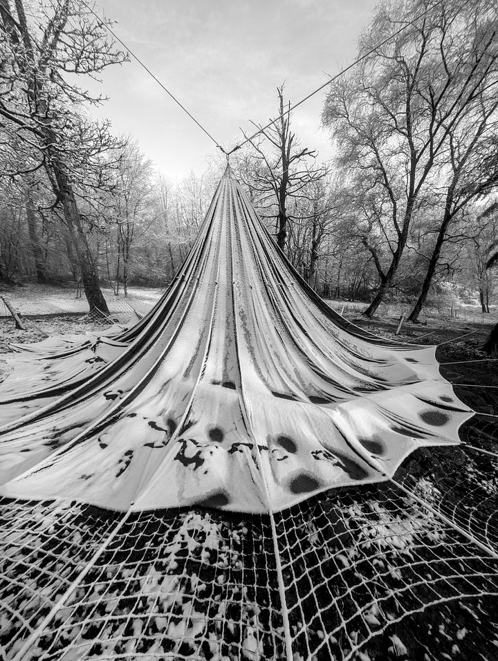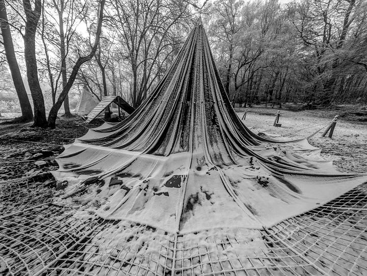 Today is that sometime. Here is the set with the unusual subject matter. I think the article title gives away the game and is also quite creative if I say so myself. But just in case my wavelength is operating at a one-person-only frequency, these are photographs of a parachute which is usually hanging from the trees and serves as an umbrella over the fire pit on the site next door to where I live. In heavier weather it is ‘dropped’ and left hanging by a thread. Quite a stong thread.
