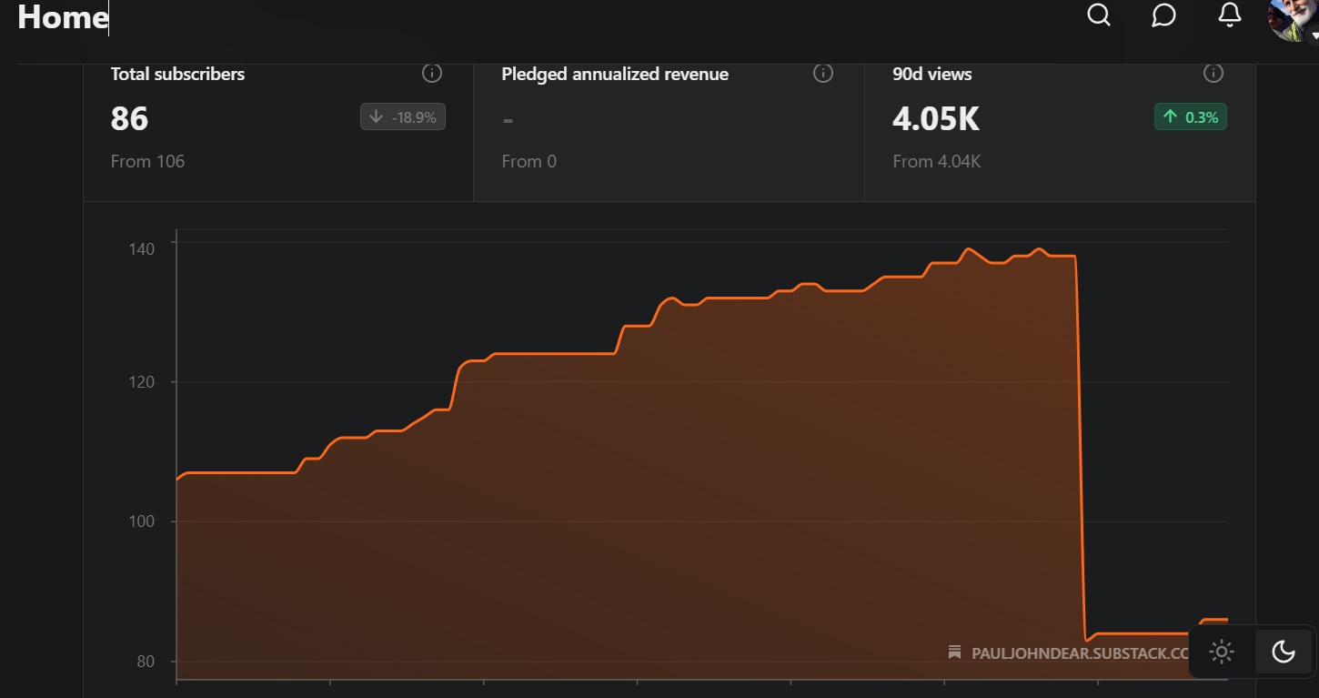 For some months now I have been trying to get help from Substack with an email not going to subscribers issue. Finally it has been resolved. As a function of the resolution I was able to track subscriber activity from my 135 readers. I discovered that 50 of them have never opened an email, never left a comment or a like, never engaged in any way at all.